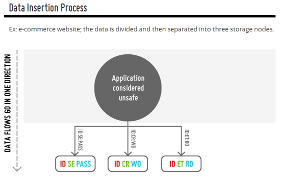 La división de datos se lleva a cabo a nivel de bits, que es más seguro que las palabras o frases enteras. Por ejemplo, en lugar de una palabra completa o número de tarjeta de crédito que está almacenado en un servidor, un numero de bits aleatorios de ellos se distribuyen entre múltiples servidores. Esta es la razón principal que la violación de un único servidor ya no es una amenaza a la seguridad. Con ZenithVault, la intrusión hacker para un servidor significa sólo tendrá el acceso a bits aleatorios sin sentido y confusos de datos parcialmente cifrados. Los atacantes tendrían que romper simultáneamente al menos tres servidores geográficamente distantes con cada uno que ejecutan diferentes sistemas operativos y entornos de aplicaciones. Esto es sólo para ser capaz de ver todo el código secreto, y mucho menos tratar de reconstruir de nuevo juntos todo de nuevo. Contra más servidores desplegados, mayor es el grado de seguridad.